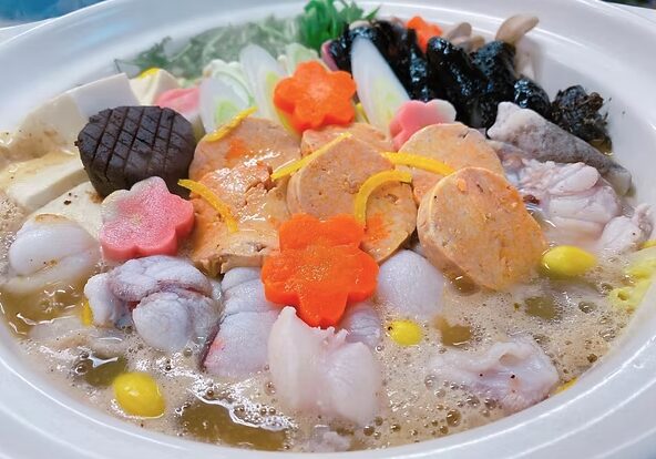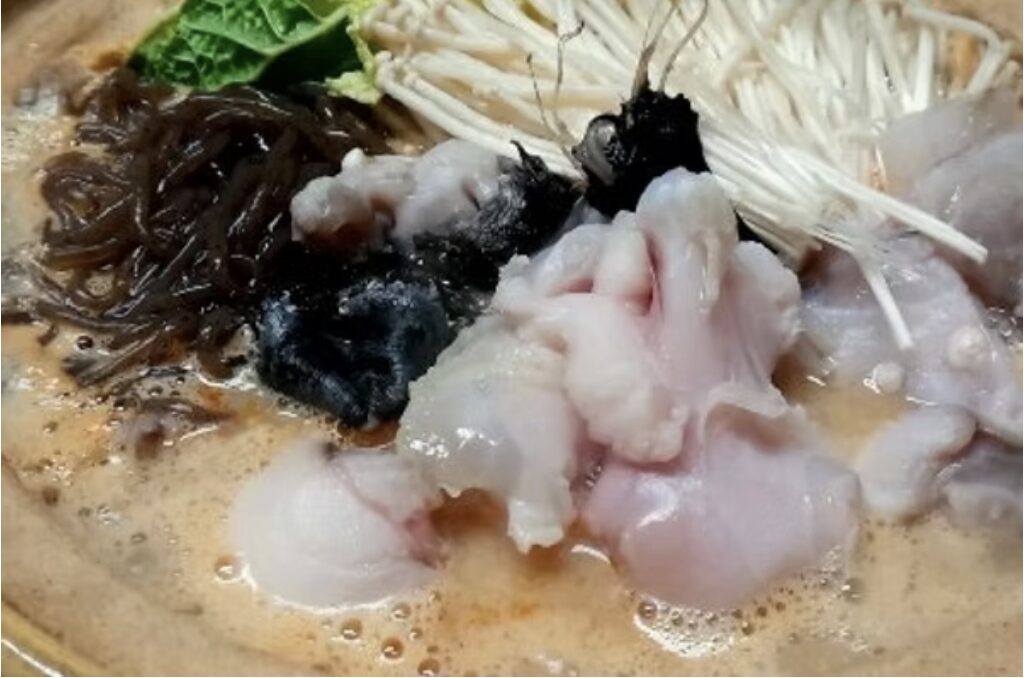 - あんこう鍋(味噌・醤油仕立て)一般的に広く親しまれているスタイルです。あんこうの身、皮、エラ、ヒレ、卵巣、胃、肝の「七つ道具」を、野菜と一緒に味噌や醤油ベースの出汁で煮込みます。コラーゲンたっぷりで、上品な味わいが特徴です。