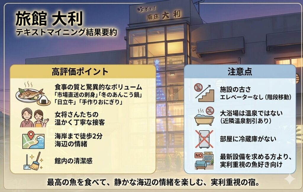 6:【口コミまとめ】圧倒的な食事満足度と、海辺の宿ならではの利便性