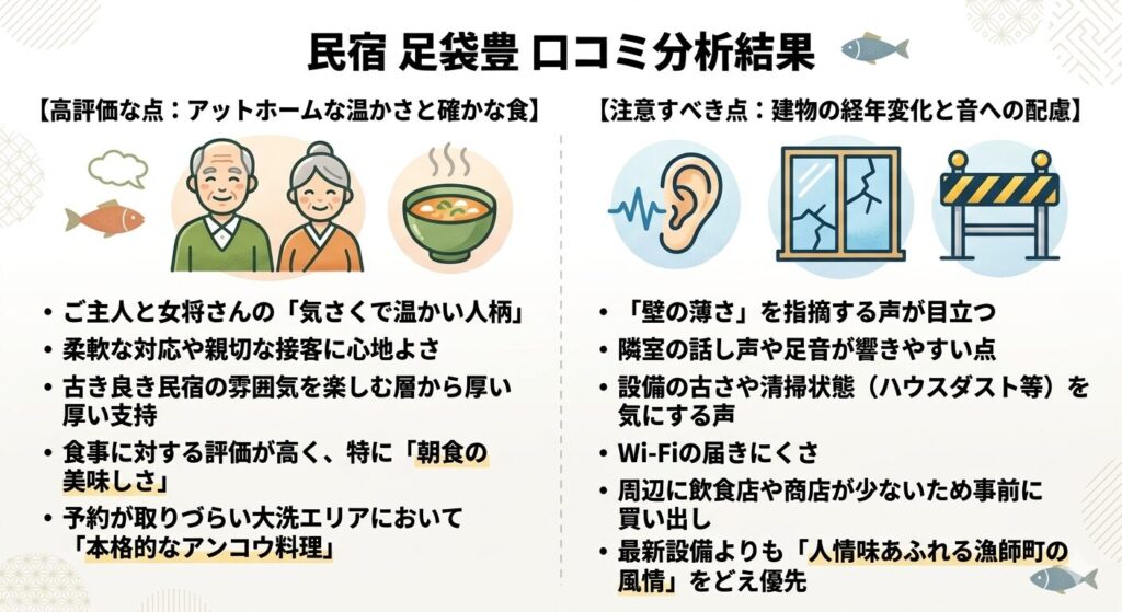 最も多く寄せられているのは、ご主人と女将さんの「気さくで温かい人柄」への賛辞です。柔軟な対応や親切な接客に心地よさを感じるリピーターが多く、古き良き民宿の雰囲気を楽しむ層から厚い支持を得ています。