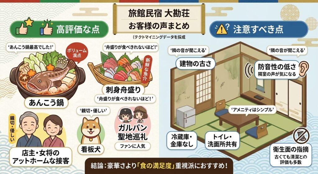 大勘荘の口コミ・評判まとめ:料理の高評価と宿泊時のポイント